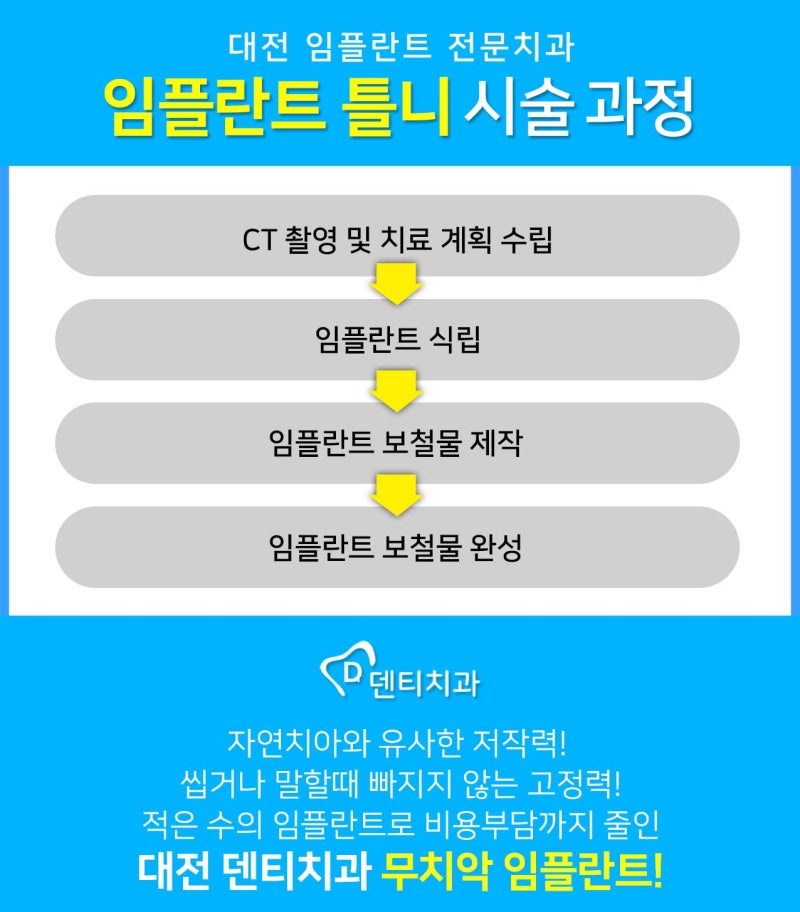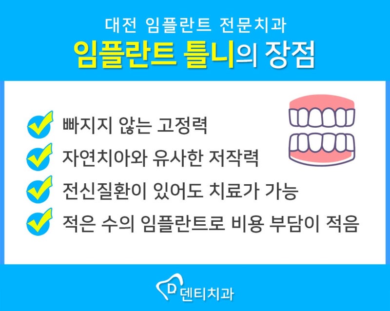 임플란트 틀니는 잇몸에 단단히 고정되어 있어 잇몸과 주변 치아에 부담을 주지 않았습니다. 또한 전체 임플란트가 아닌 최소한의 임플란트를 식립하기 때문에 #대전 임플란트의 가격적인 부담도 매우 적은 편이었습니다. 경제적인 부분과 건강을 모두 생각했을 때 매우 합리적인 선택이었습니다.임플란트 틀니는 대부분의 치아를 잃은 노인층의 수요가 많았습니다. 연상 환자의 경우 전신질환을 앓거나 개인적으로 복용하는 약물이 있어 임플란트 치료에 제약이 있었습니다.이런 상황에서 신중하게 부담 없는 임플란트 틀니 시술을 할 수 있으려면 숙련된 의료진과 함께하는 것이 안정적이었습니다.대전임플란트치과는 대표원장이 직접 진료하는 병원으로 고령의 환자들도 다수 찾고 있었습니다. 임플란트 틀니 경험도 많아 믿고 맡길 수 있는 대전치과로 유명한 곳이었습니다.고령 환자들은 세심한 일대일 관리가 꼭 필요했습니다. 개인의 건강상태와 치아상태에 맞게 하나하나 임플란트 틀니 시술을 진행해야 전반적인 건강에 무리가 간다.환자중심의 1:1 맞춤진료 설계를 원칙으로 하는 대전 임플란트 치과는 고령 환자에게도 체계적인 일대일 치료로 만족하고 있는 대전치과 유명한 곳입니다.임플란트 틀니 시술 시 건강에 부담이 가지 않도록 여유로운 치료 계획을 세우는 것은 물론 평소 습관까지 고려한 치료로 일상생활이 더욱 편해졌습니다.첨단 장비를 이용하여 임플란트 틀니를 진행하면 정확한 검진이 가능함은 물론 개인에게 잘 맞는 보철물도 제작할 수 있었습니다. 그만큼 다양한 최신 장비를 활용할 치과를 찾는 것이 중요한 부분이었습니다.대전임플란트치과는 병원 자체 임플란트센터를 보유하고 있는 대전치과 유명한 곳으로 정밀진단부터 보철물 제작, 임플란트 식립에 이르기까지 첨단장비를 활용해 보다 효율적인 치료가 가능했습니다.정확도 높은 시술이 진행되면서 노년층 환자들도 임플란트 시술에 대한 부담이 적은 편이었습니다. 또 #대전 임플란트 가격도 부담이 적은 편이었습니다.개인 구강구조, 신체적 특성 등 여러 부분을 고려한 임플란트 틀니 시술을 경험하기 위해서는 임상경험이 풍부한 치과를 선택하는 것이 바람직했습니다. 임플란트 센터를 보유한 대전 임플란트 치과는 다수의 환자를 대상으로 한 임플란트 틀니 경험이 있어 효율적인 치료가 가능했습니다.환자의 다양한 특성을 고려한 임플란트 틀니가 가능하고 난이도가 높을 것으로 보이는 전신질환, 고령환자 시술도 성공적으로 진행된 경험을 가지고 있었습니다.연상의 환자는 치아가 기본적으로 약해져 있는 상태이기 때문에 정기적인 치과 검진을 통해 임플란트 틀니를 관리하는 것이 중요했습니다.치과를 찾으면 임플란트 상태를 점검할 수 있을 뿐만 아니라 다른 치아 문제도 동시에 발견해 효과적으로 대응할 수 있었습니다. 대전임플란트치과는 분과별 의료진 협진이 이루어져 임플란트 치료 후에도 꾸준히 방문하기 좋은 대전치과 유명한 곳입니다.한 군데서 여러 가지 치아.아, 문제를 해결할 수 있는 원스톱 진료로 환자분들의 만족도가 굉장히 높았고 #대전 임플란트 가격도 만족도가 굉장히 높았습니다.임플란트가 좋은 건 알지만 다수의 치아.아, 수술해야 할 비용 문제로 고민했더니 임플란트 틀니를 추천했어요.여러 개의 임플란트를 식립한 후 틀니를 고정해 사용하는 방식으로 #대전 임플란트의 가격 부담을 크게 줄일 수 있을 뿐만 아니라 실생활에서 사용할 때 편리하다는 것이 장점입니다.비용면에서도 실생활면에서도 만족스러운 임플란트 틀니로 완전히 색다른 나날을 경험해 보세요!비용면에서도 실생활면에서도 만족스러운 임플란트 틀니로 완전히 색다른 나날을 경험해 보세요!
