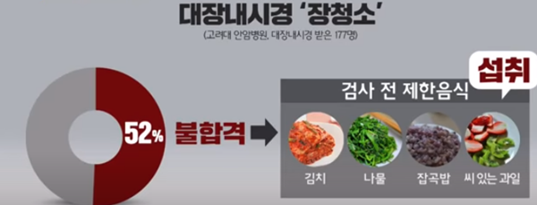 섬유질이 많은 음식은 피해주세요. 섬유질이 많고 대장에 장시간 남아 있기 때문에 제대로 된 검사가 어려울 수 있습니다. 나물류, 콩, 참깨, 채소, 김치, 옥수수, 씨앗과일 등 섭취를 자제하는 것이 좋습니다.
