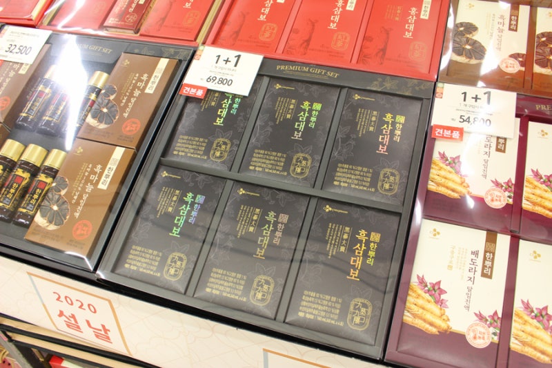 CJ한풀이 다양한 제품을 볼 수 있는데 제 픽은 흑삼대 보물!!많은 홍삼제품 중 가장 고급스러운 패키지라 어른들 선물로 딱일 것 같아요.40ml*24포가 69800원인데 지금 홈플러스 청라점에서는 1+1 행사중이라 박스당 약 35000원 정도여서 가격도 괜찮더라구요 🙂 사실 얼마전 흑삼에 관한 기사를 보고 흑삼이 더 끌렸던 것 같아요.